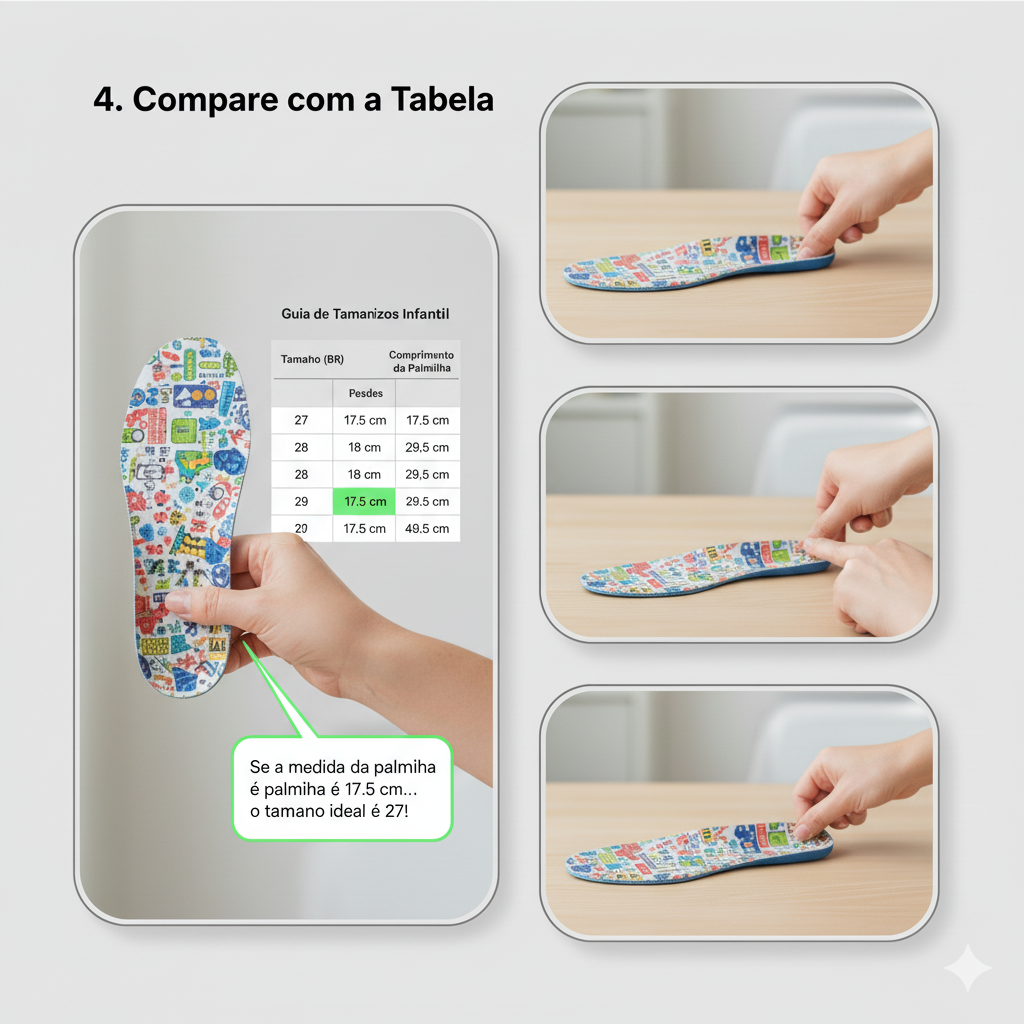 Use esta técnica simples para medir a palmilha de um calçado que seu filho já usa e compare com a nossa tabela.